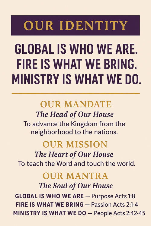Here, disciples are shaped, leaders are forged, and families find covering. Here, theology meets power, scholarship meets Spirit, and culture meets Kingdom. Through the Global Alliance Network, Global Fire Institute, and our digital ministry platforms, we are raising a generation equipped to think deeply, live boldly, and change their world.